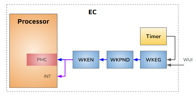 在 wake-up 事件的流程,由觸發訊號產生開始,經 WKEDGn 會先確認中斷是否符合要求(可以設定要求為 Falling Edge/ Rasing Edge/ Any Edge),當符合要求就把WKPNDn的相對位元設為1,表示有 wake up 事件產生,再經由 WKENn 確認wake up 事件是否為 Enable ,確認為 enable 後,把事件傳送到 Power Management Control Unit [PMC]去通知核心處理器離開 Idle mode。同時,也把事件傳送給 ICU 在 EC 回到 Active 時,處理中斷任務。